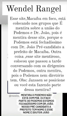 Na imagem acima, vemos uma postagem realizada por Wendell Rangel, o qual é suplente de vereador em Macaíba, dizendo que o site "Macaíba em Foco" de autoria de Dejackson Alvares, está propagando "mentira", sobre a situação do partido Podemos. Segundo Wendell Rangel, o Podemos está "fechadíssimo" com Dr. João e não com Netinho França.